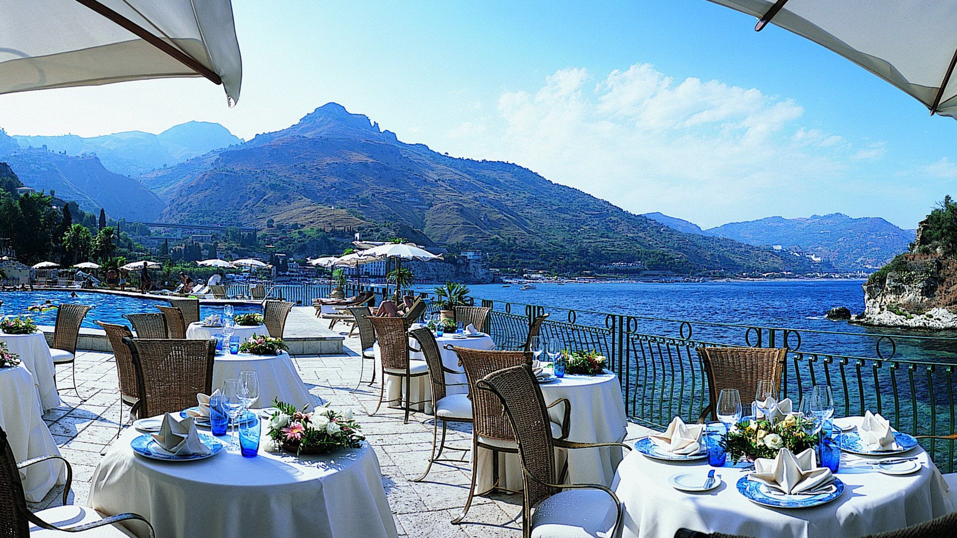 The splendid terrace overlooking the sea with teak flooring can host up to 1,000 guests for unforgettable evenings.